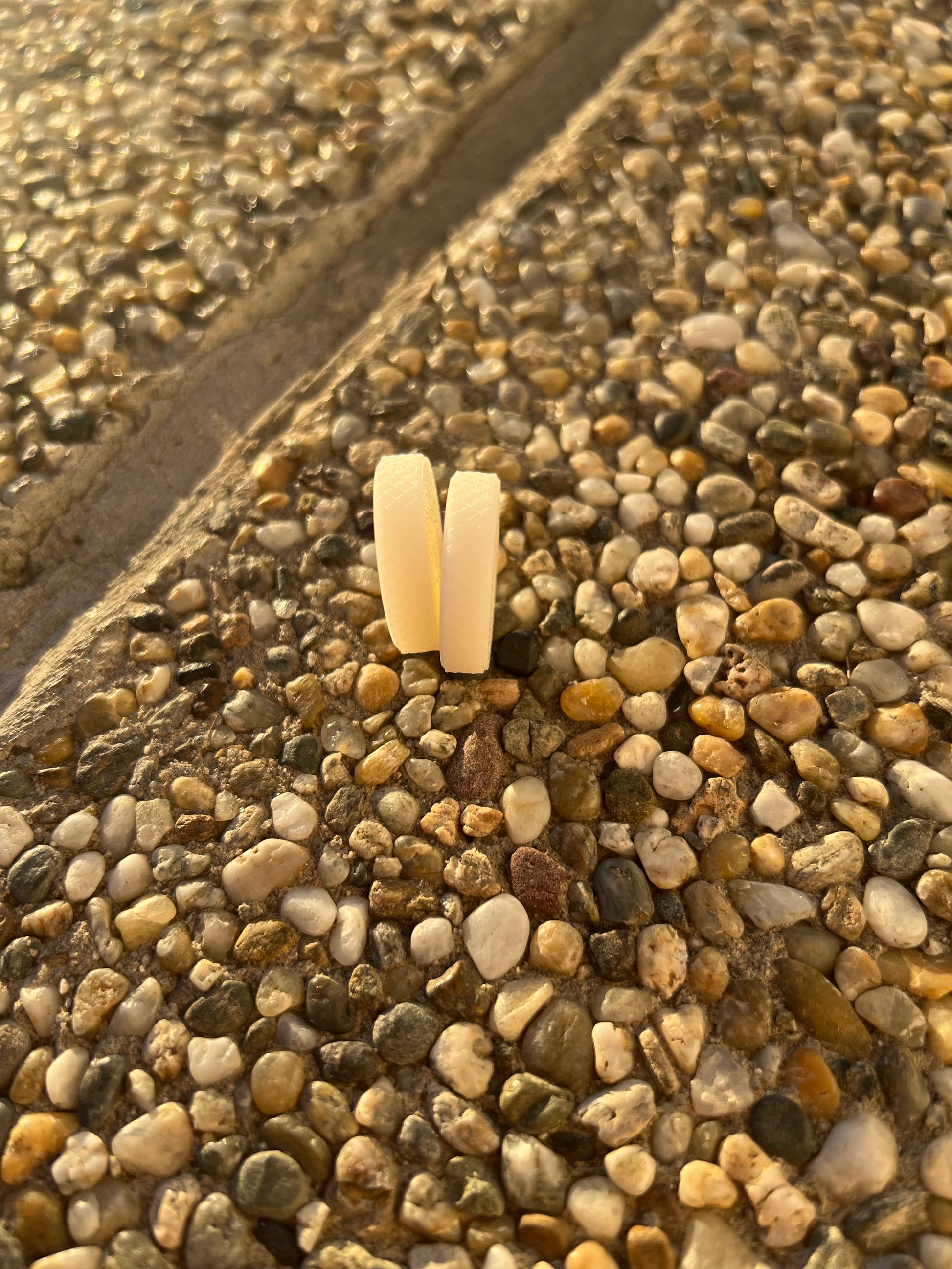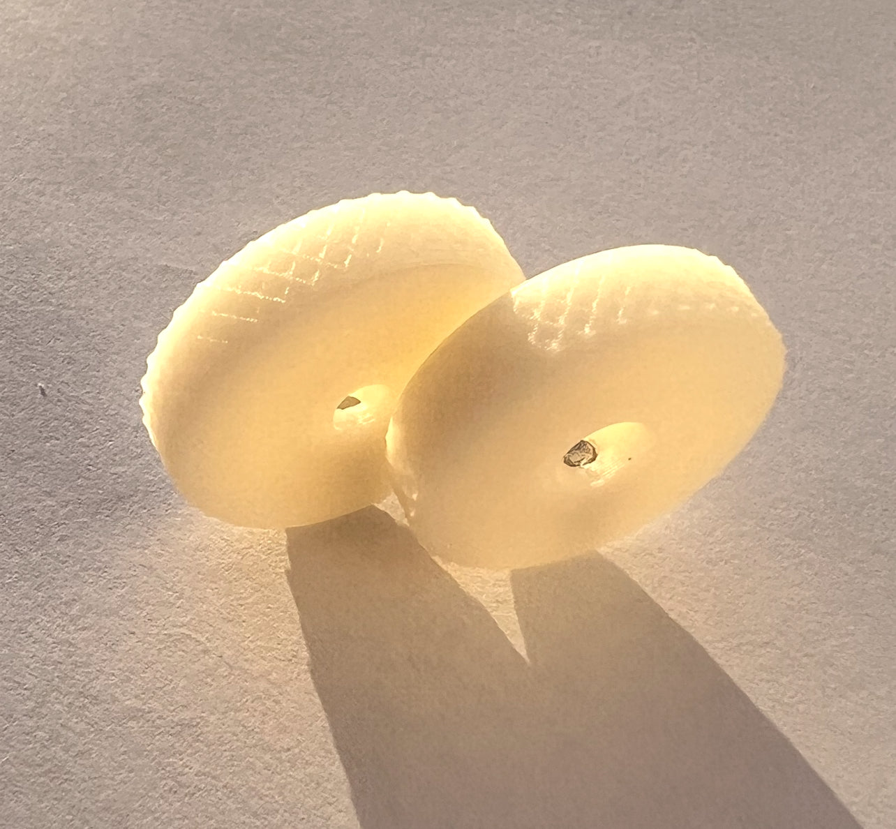 3D printed in Nylon. Slightly more parchment colored, semi-transparent look when compared to classic white rollers. (think LP nylon nut). The last photo in the gallery shows white and nylon rollers side by side.