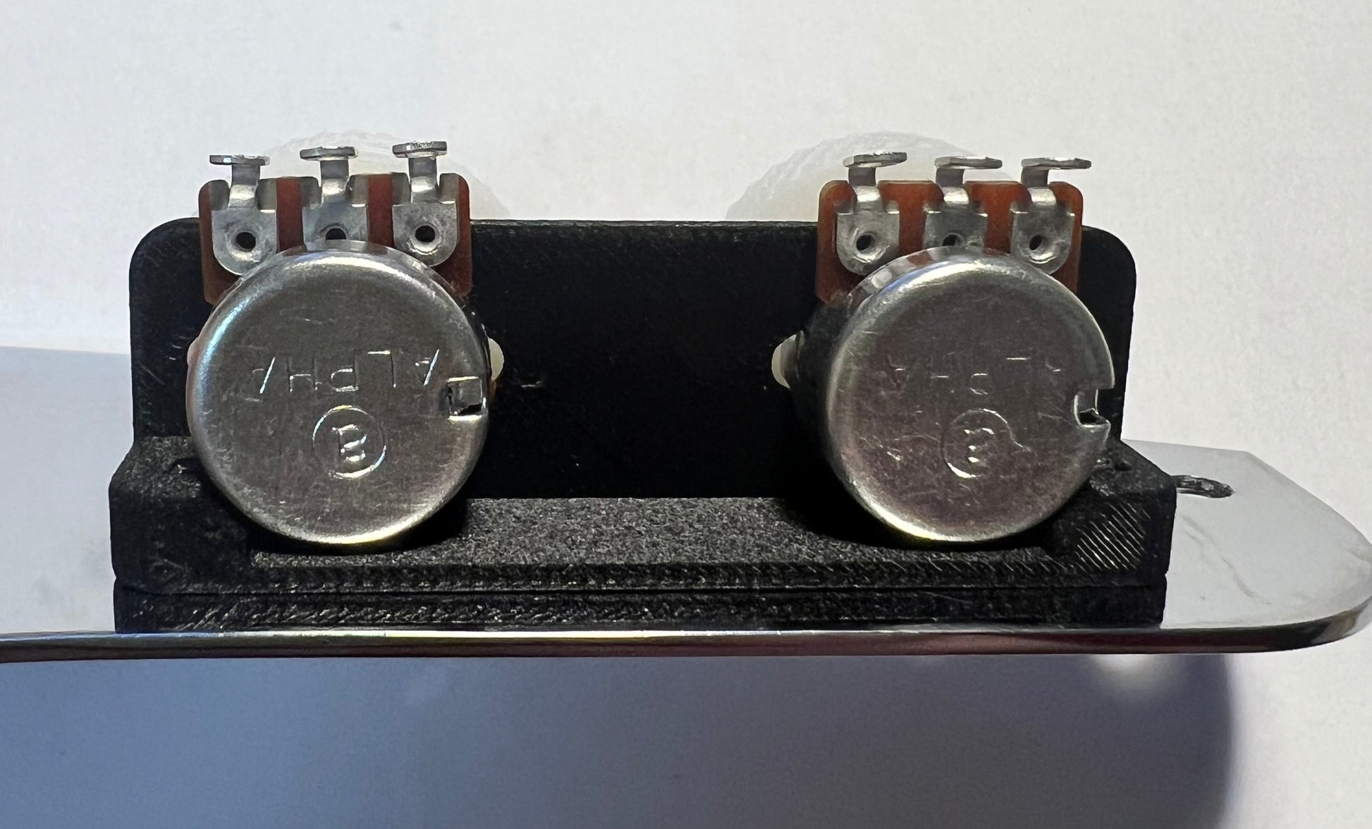 Carbon fiber reinforced potentiometer brackets for Jaguar or Jazzmaster. Standard mounting screw spacing - fits Fender, Allparts and all other aftermarket pickguards and control plates that use standard spacing.